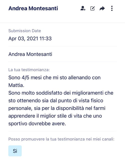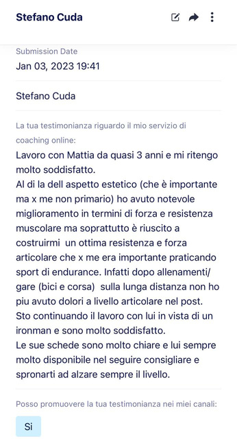 dopodiché se vorrai lavorare con me il primo passo sarà la compilazione di un questionario che mi consentirà di capire come impostare al meglio il tuo programma personalizzato.